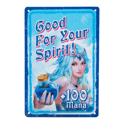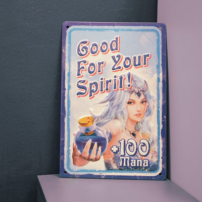 Mit dem Blechschild Good for Your Spirit geht dir das Mana niemals aus: Gleich 100 Einheiten Mana bekommst du in Form eines hellblauen Zaubertranks. Magie musst du zur Befestigung auch nicht nutzen: Es reichen einfach Schrauben, Nägel oder doppelseitiges Klebeband (nicht enthalten). Ob du es als Motivation für den Tag nutzt, als Erinnerung daran, deine Energie mit Nahrung, Schlaf oder sozialen Kontakten aufzuladen, oder einfach als nerdige Deko – es ist in jedem Fall good for your spirit. ;)