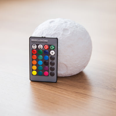 The small luminous moon replica is of course only real with the typical surface structure, craters and Neil Armstrong's footprint! A few cool features have also been added to the moon. With a remote control, you can simply switch the moonlight on and off, choose between 16 different colors and 4 color change programs and adjust the light intensity.