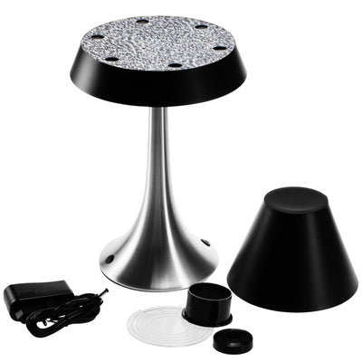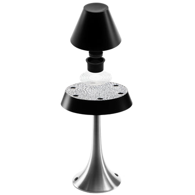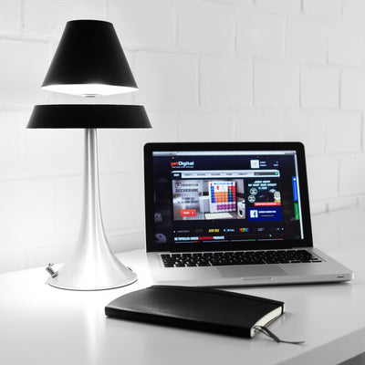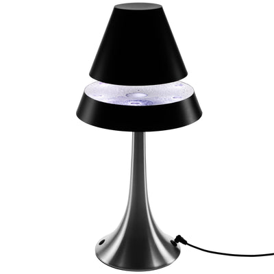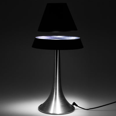 Electromagnetic levitation makes the shade float, and as the word suggests, it requires electricity. The shade itself sits on a strong magnet, which is repelled by another magnet in the lamp base. A sophisticated relay system ensures the right balance.