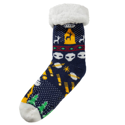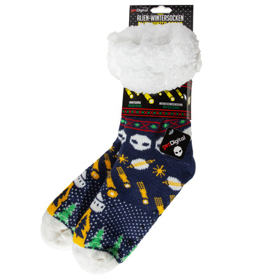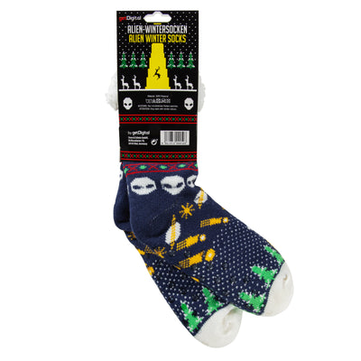Wenn Du diese Wahrheit (!) akzeptierst, bist Du bereit für die Alien-Wintersocken von getDigital! Dieses Paar herrlich flauschiger Socken zeigt unsere außerirdischen Freunde und ihre fliegenden Untertassen dabei, wie sie Rentiere und Tannenbäume entführen. Natürlich nur für streng wissenschaftliche „Experimente“… Der obere Teil der Socken verfügt über einen extra-flauschigen Saum, sodass Du die Socken nie wieder ausziehen wollen wirst! Die Socken sind in einer Einheitsgröße verfügbar, die bis zu einer Schuhgröße von 46 EU passt.