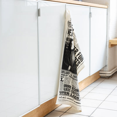 • These tea towels depict the front page of an issue of the Daily Prophet from Harry Potter