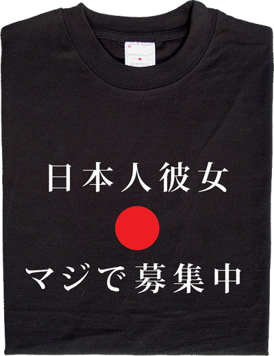 A shirt from our series for Japan fans: The Kanji (Japanese characters) on this shirt read "Nihonjin kanojo majide boshuchu", which (in order) means "Japanese", "girlfriend", "seriously" and "wanted". Together, it means "Seriously looking for a Japanese girlfriend".