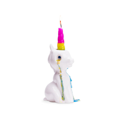 This porcelain candle holder is modeled after a downcast unicorn sitting on the ground. As soon as you light one of the two rainbow candles and the wax begins to melt, the little unicorn can't control itself and starts to cry big tears. The colorful tears make the noble mythical creature look sliiightly creepy. If your unicorn has cried out all its tears, you can bring it to the brink of the abyss again with the matching replacement candles and take revenge for all the years of terrible unicorn products. ;)