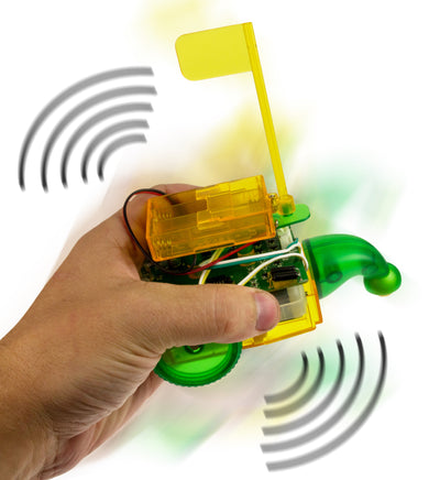 The Shake Shake Robot on the other hand, with its trailer look and a length of 12 cm, is the most inconspicuous representative of the robot family at first glance, but possibly also the most interesting. Its path is programmed by first shaking the Shake Shake Robot. Each type of shake corresponds to a specific movement. The Shake Shake Robot can store up to 15 commands, so nothing stands in the way of complex maneuvers. It is the best choice for small competitions or even mini golf.