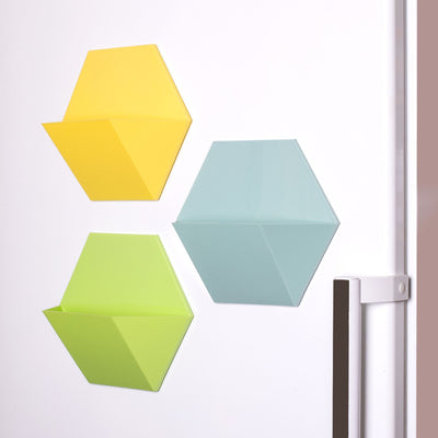 • Set aus drei magnetischen Töpfen aus Metall in blau, gelb und grün