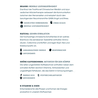 Ingredients: Matcha green tea extract from leaves (Camellia sinensis) 43%, green coffee beans (Coffea arabica) 21%, Brahmi extract from the whole plant (Bacopa monnieri) 15%, anti-caking agents (croscarmellose sodium, silicon dioxide, magnesium stearate), glazing agents (hydroxypropylmethylcellulose, hydroxypropylcellulose, cellulose microcryst., triglycerides), dyes (natural dyes from apple, red algae, safflower, lemon, radish, blackcurrant), iron diphosphate, D-calcium pantothenate, flavoring (natural mint), pyridoxine hydrochloride, thiamine mononitrate, cyanocobalamin