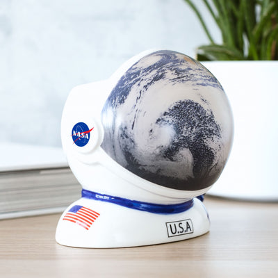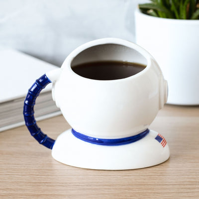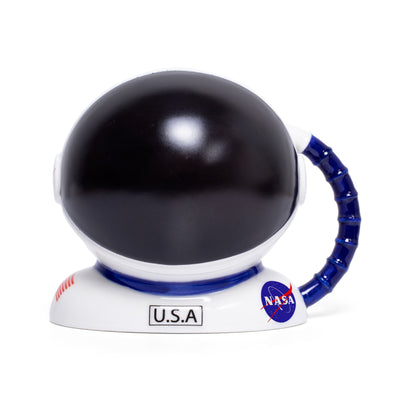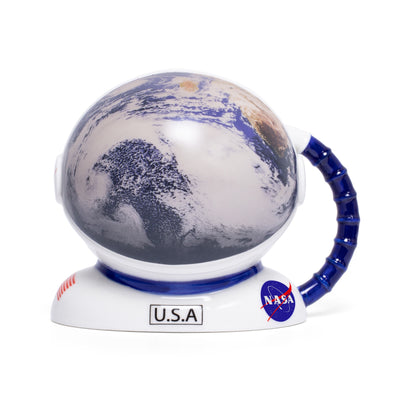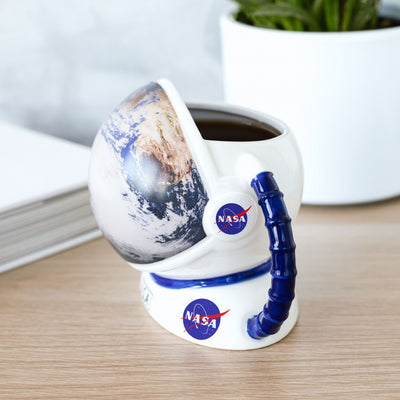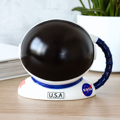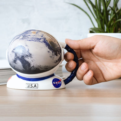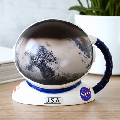 This NASA astronaut thermo effect mug is modeled on an astronaut suit: The "shoulders" of the suit feature the NASA logo and the American flag, while the handle of the mug is modeled on a hose for oxygen supply. The highlight of the cup is the helmet: when cool, it is completely black, but when hot liquids are poured into it, a reflection of the Earth's surface becomes visible in the helmet's visor. When the cup cools down, the visor turns black again.