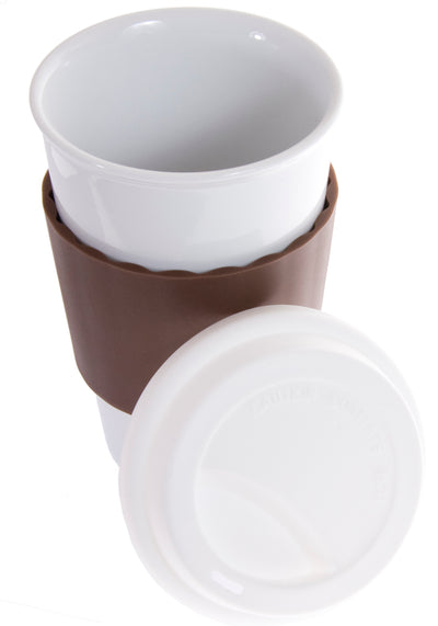 The Eco Cup, on the other hand, is environmentally friendly. It has all the features of a typical paper cup used in coffee chains, but it is reusable! It is made of high-quality, 4 mm thick porcelain. The typical lid of the Eco Cup is not made of plastic but of silicon, and also has a drinking opening and an air hole. To prevent you from burning your fingers, the paper sleeve has also been replaced by a silicon sleeve.