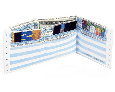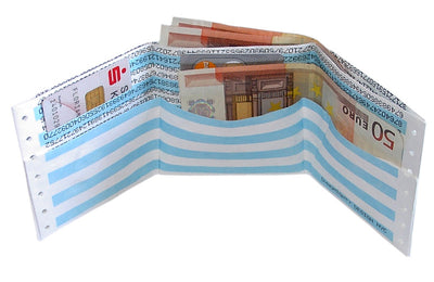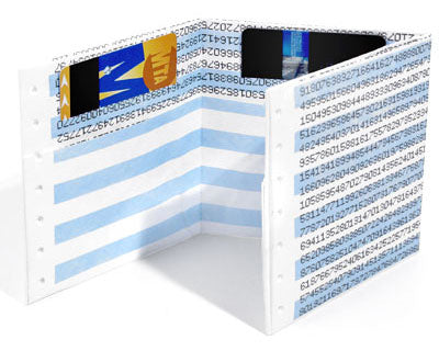 The design of this wallet mimics the old continuous printer paper, and on the paper are the first 3000 digits of Pi, printed in dot matrix printer style. The wallet has 6 slots for credit cards as well as a compartment for banknotes, which allows you to hide and secure the notes with a flap. The material is water-repellent and slightly stretchable, so it can perfectly adapt to the contents. Please note that there is no compartment for coins.