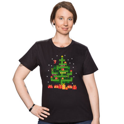 "It's a me - Santa Mario!" The "Super Mario Christmas Tree" T-shirt features an original Christmas tree designed in the pixel art style of the classic Super Mario games. The pixelated graphic is reminiscent of the early days of home consoles and brings a nostalgic retro aesthetic into play. The "tree" consists of typical elements from the Mario game world, such as green pipes, question mark blocks, and coins, and is brought to life by the iconic main character Mario in a Santa Claus costume, making his way through the levels of the Christmas tree past Goombas and Bob-ombs. Every detail of the tree reflects the characteristic designs and colors of the Mario world.