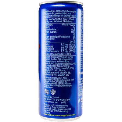 Superman Energy Drink consists of a whey-based mixture with a fruity-fresh taste and added vitamins and caffeine. Despite the lack of carbonation (which would actually be a hindrance when flying), the drink is quite sparkling and even deposit-free.