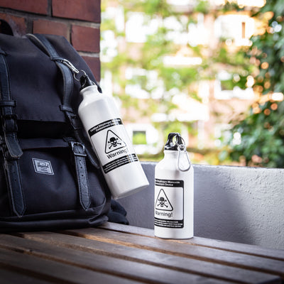 For this reason, you may only use DHMO in the DHMO drinking bottle to protect yourself and your surroundings! The English warnings clearly show what DHMO can cause: death! Joking aside, DHMO is simply H2O, better known as water. It's funny how some people panic when you use the chemically correct (and admittedly only jokingly used) name of something... So you can be prepared for this aluminum drinking bottle with screw cap and carabiner hook to cause some excitement in everyday life. It might even keep drink thieves away. After all, who would voluntarily drink from a bottle with warning labels and a skull and crossbones? ;)