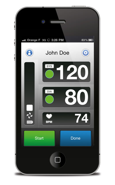 The iOS device is connected to the blood pressure monitor for the measurement and is then used not only to store the data, but also to operate the monitor.