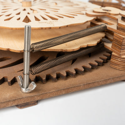 drawing machine wooden kit in the style of Da Vinci! After assembly, you hold an impressive construct in your hands that takes over the drawing for you! As soon as you turn the key on the right side, the mechanical arm begins to draw fascinating pictures with the pen you previously placed in its fingers! To ensure you (and the arm) don't get bored, four different motif discs are included, allowing you to quickly swap the pictures the arm draws.