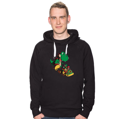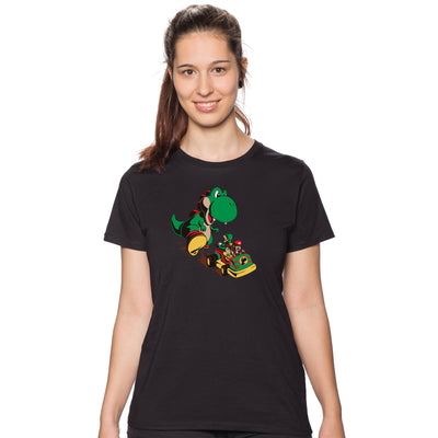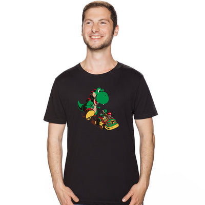 Exactamente una situación así (afortunadamente sin Goldblum) muestra la camiseta "Jurassic Kart": Los fontaneros italianos Mario y Luigi huyen en un kart junto con la princesa Daisy de su anteriormente lindo e inofensivo saurio doméstico Yoshi. Porque este ha crecido al tamaño de un T-Rex y ahora quiere probar cómo sabe el carpaccio de fontanero. La legendaria cabra parece que no duró mucho. ;)