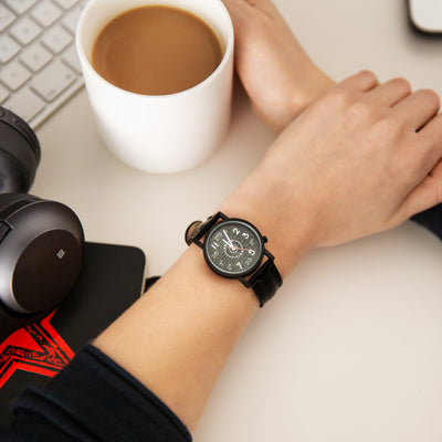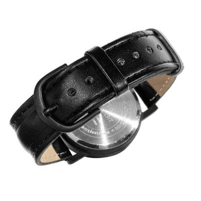 El reloj de pulsera cuenta con un mecanismo de cuarzo japonés y una correa de cuero negro. Se entrega en una caja metálica decorativa.