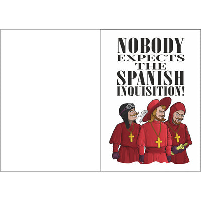 • Carte de vœux pour tous ceux qui aiment les surprises ; Montre l'Inquisition espagnole du sketch légendaire de Monty Python ; Ne contient pas de fauteuil confortable
