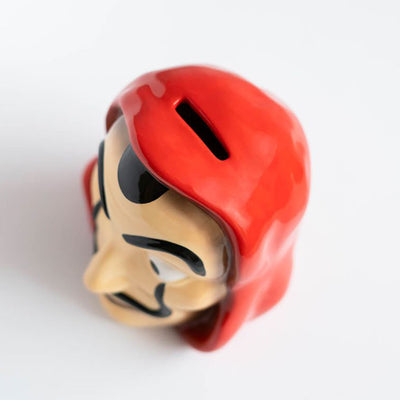 Mais heureusement, le titre anglais ridiculement générique ne change rien à la qualité de la série – et rien non plus au fait que la tirelire «Maison de Papier» a l'air sacrément cool ! Désormais, tu peux garder ta petite monnaie dans une tête en céramique qui, tout comme les personnages principaux de la série, porte un masque de Dalí. Pour retirer de l'argent, tu n'as pas besoin de braquer une banque, il te suffit d'enlever le bouchon au fond. ;)