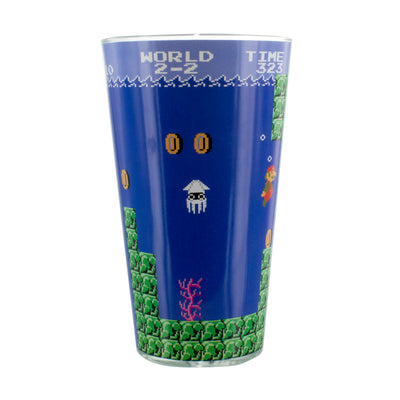 Nous connaissons tous la tempête proverbiale dans un verre d'eau - mais connais-tu déjà le niveau de jeu dans un verre d'eau ? Sinon, procure-toi le verre sous-marin « Nintendo Super Mario » ! Car ce récipient à boisson geek ne contient pas seulement 400 ml, mais montre aussi un niveau sous-marin du jeu de saut et de course par excellence ! Si tu agites un peu le verre, tu peux même créer un effet de vague vraiment trompeur ! ;)