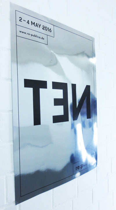 Le "TEN", le nom du thème de la re:publica 2016, représente la dixième édition de l'événement. En miroir, le lettrage donne le mot "NET".