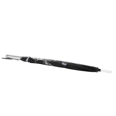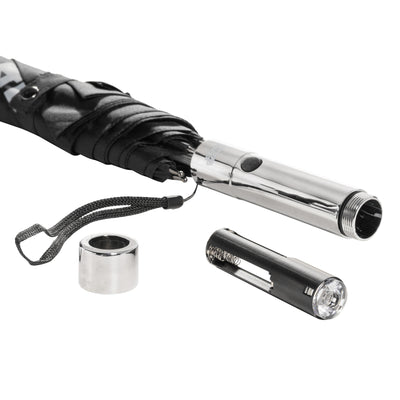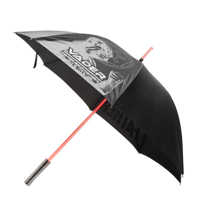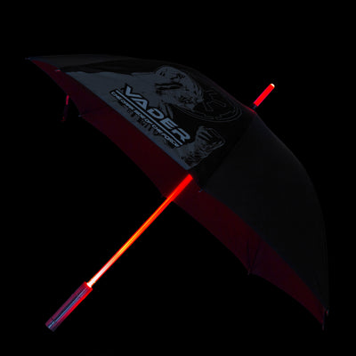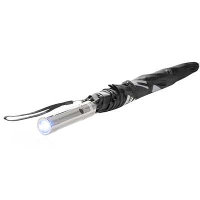 Mais ce parapluie ressemble aussi à s'y méprendre à un sabre laser et dispose même d'une Fonction lumineuseDès que tu appuies sur le bouton de la poignée détaillée, le manche du parapluie se transforme en une lame lumineuse ! De plus, la poignée contient une Lampe de poche Ainsi, tu ne risques pas de déchirer ton sac à dos avec ton sabre laser en cherchant tes clés. ;)