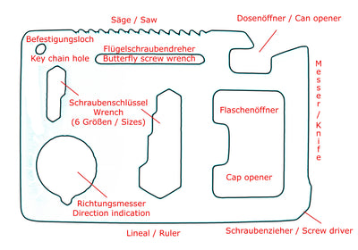 Questo ingegnoso strumento offre 9 funzioni, ma ha le dimensioni di una carta di credito e può essere facilmente riposto nel portafoglio. È realizzato interamente in acciaio inossidabile ed è quindi molto robusto. Contiene i seguenti strumenti in dettaglio: