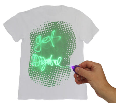 • Originale Lazershirt che può essere scritta con una luce UV e si illumina al buio.