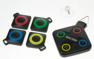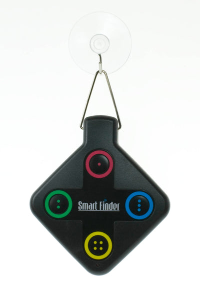 Esiste anche una versione più grande di questo sistema in due parti, lo SmartFinder 4 in 1, che consiste in quattro ricevitori e un trasmettitore con quattro pulsanti. Il principio è lo stesso della versione piccola, ma in questo caso ogni ricevitore emette un segnale acustico diverso in modo da poterlo riconoscere. I ricevitori del sistema 4 in 1 hanno anche un nastro biadesivo sul retro. Puoi attaccare il trasmettitore con una ventosa e agganciarlo al frigorifero, ad esempio.