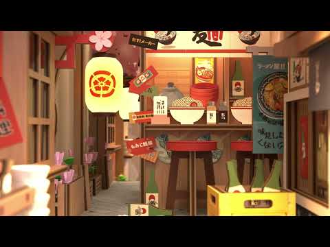 • Book Nook dettagliato in stile di una strada di cibo di strada giapponese con lanterne