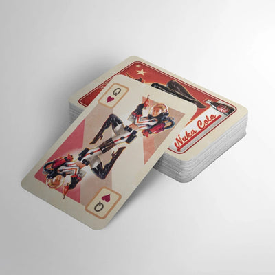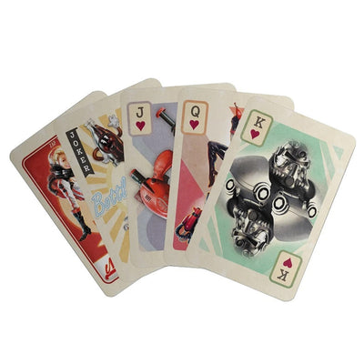 Natuurlijk heeft de fabrikant van de populairste frisdrank van de toekomst ook een eigen kaartspel uitgebracht, dat je de donkere uren na de cryoslaap opvrolijkt: De Fallout Nuka World speelkaarten. Het Fallout-kaartspel bevat een klassiek pokerspel met 52 speelkaarten en 3 jokers. Alle kaarten zijn voorzien van Nuka Cola- en Fallout-motieven zoals de Nuka-Girl, de Power Armor of de Thirst Zapper.