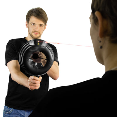 Voor beter richten heeft het nieuwe model van de Airzooka een ingebouwde laser. Net als elk verwoestend wapen in goede actiefilms. :) Hiermee kun je je volgende slachtoffer precies richten - maar nooit in de ogen schijnen!