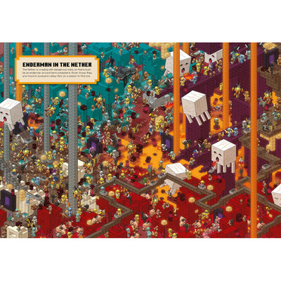 Hij is echter niet je enige tegenstander: Naast de explosieve Creeper moet je tussendoor ook een angstaanjagende Enderman en andere Minecraft-monsters zoeken. Daarbij betreed je niet alleen de bovenwereld, maar ook de Nether en het einde. Op de 40 kleurrijke pixelpagina's van het zoekboek zijn nog talloze andere details en verrassingen te ontdekken, als je maar lang genoeg kijkt. Het is trouwens geen kwaad als je een beetje Engels kunt, want de teksten in het boek zijn in het Engels geschreven. Maar voor het zoeken en ontdekken op de afbeeldingspagina's heb je alleen goede ogen nodig. ;)