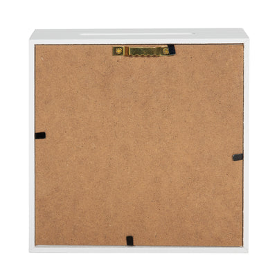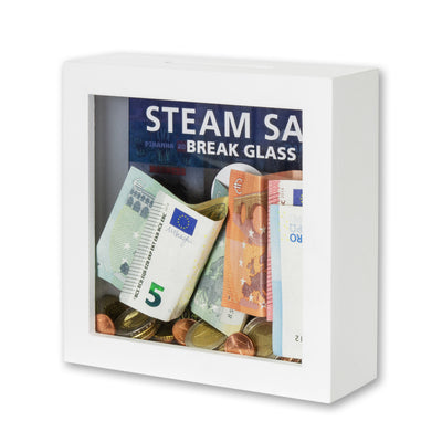 Die Spardose kann mit einem Nagel oder einer Schraube (nicht enthalten) an die Wand gehängt werden und lässt sich an der Rückseite öffnen. Du musst also nicht direkt die Scheibe einschlagen, um an Dein Erspartes zu kommen. ;)