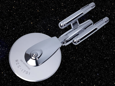 De Star Trek Enterprise Pizzasnijder is een officieel gelicentieerd Star Trek verzamelobject. Stuur hem alsjeblieft niet naar de onbekende uitgestrektheden van je vaatwasser, daar zou zijn buitenmantel schade kunnen oplopen.