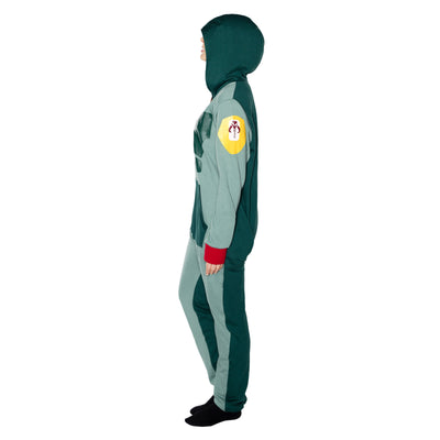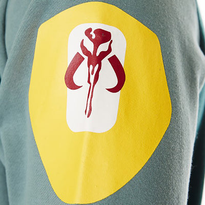 So wie Boba Fetts Rüstung setzt sich der Jumpsuit aus verschiedenen Teilen in den typischen Farben zusammen. Darin eingepasst ist auch die geteilte Kängurutasche am Bauch. Auf den Armen sitzt das Mythosaurier-Emblem, auf der Brust das Mandalorianer-Abzeichen. Auch auf eine Kopfbedeckung muss Boba Fett nicht verzichten, die Kapuze ist allerdings ein bisschen weniger widerstandsfähig als der originale Helm. Dafür aber weniger kalt und unbequem. ;) Geschlossen wird der Einteiler mit einem stabilen Reißverschluss an der Vorderseite und sofort hat man eine ganze Ausrüstung angelegt.