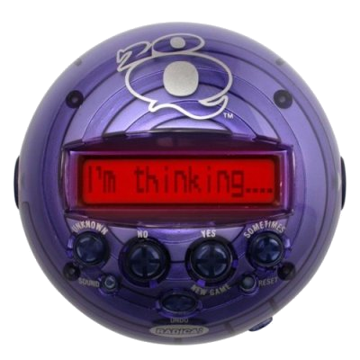 Das kleine Gerät stellt Dir 20 Fragen zu den 4 Themenbereichen "Tier, Pflanze, Mineral oder Anderes", die auf dem Display erscheinen und die Du mittels Knopfdruck mit "ja, nein, unbekannt oder manchmal" beantworten kannst. Zu Deinem Erstaunen wird es Dir danach tatsächlich das nennen, an was Du gedacht hast. Meistens jedenfalls :-) Wenn Du schon mal üben willst, wirfst Du am besten einen Blick auf die Online-Version