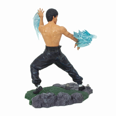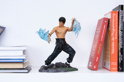 Dem disziplinierten Kampfkünstler und seinen Filmen ist diese detaillierte und farbenfrohe Bruce Lee "Be Water" Sammelfigur gewidmet. Dabei wird Lee in seinem typischen Kampf-Outfit gezeigt: nur mit einer schwarzen Hose bekleidet und mit seinen flinken Fäusten bewaffnet. Die Flexiblität seiner fließenden Bewegungen wird hier von einer blauen Spur verdeutlicht, die an Wasser erinnert. Die Sammelfigur steht auf einem Diorama, das dem leichtfüßigen Helden etwas Stabilität verleiht.