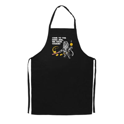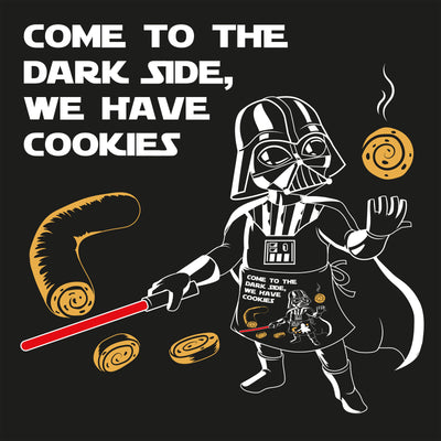 Wer kann dem Bösewicht, der auf der Schürze seine Kräfte und sein Energieschwert zum Backen verwendet, seinen Verrat verübeln? Schließlich ist er der lebende Beweis dafür, dass die dunkle Seite wirklich Kekse hat. Und die sehen auch noch verdammt lecker aus. Da bekommt man doch direkt Lust, selbst welche zu backen und danach ein paar Planeten zu erobern...