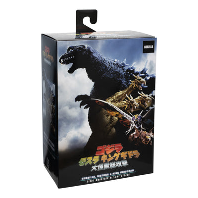 Bei der Godzilla Classic 2001 Actionfigur handelt es sich um eine bewegliche Actionfigur, die Godzilla aus dem Film „Godzilla, Mothra & King Ghidoran“ nachempfunden ist. In diesem trashigen Mega-Monster-Crossover tritt Godzilla gleich gegen 3 weitere japanische Riesenkreaturen an (Baragon wird im Titel nicht erwähnt, spielt aber eine nicht unbeachtliche Rolle). Und natürlich nutzt er hier auch seine mächtigste Waffe: den atomaren Hitzestrahl. Das leuchtende Blau des Hitzestrahls zeigt sich auch um Godzillas Maul und seine Rückenplatten.