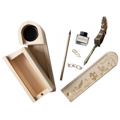 Es enthält eine hölzerne Schreibutensilienbox, ein Lineal mit Harry Potter Symbolen, einen Tintenfeder-Stift samt Tintenfässchen und Tinte, einen goldenen Bleistift und zwei Büroklammern in der Form von Harrys Blitz-Narbe und Lunas Gespensterbrille.