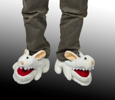 • Hausschuhe mit dem Aussehen des Killerkaninchens von Caerbannog aus Monthy Pythons "Ritter der Kokosnuss".