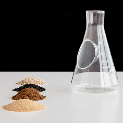 Inhalt: Glaskolben, Aktivkohle, Kokosfasern, Sand, Kieselsteine, Korken