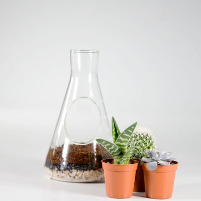Mithilfe der Anleitung auf der Verpackung füllst du einfach die Kokosfasern, den Sand, die Aktivkohle und die Kiesel in der richtigen Reihenfolge hinein. Welche Pflanzen du anschließend hinein setzt, kannst du selbst entscheiden. Wichtig ist nur, dass es nicht zu viele sind (2 – 3 sind ausreichend) und ihre Bedürfnisse, was Licht und Wasser angeht, gut zueinander passen. Je nach Art der Pflanzen musst du nun tatsächlich nur noch extrem selten etwas Wasser darauf sprühen.