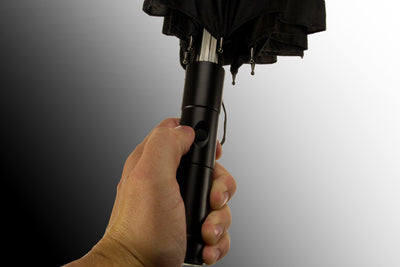 Mit einer Schlaufe lässt sich der Schirm sowohl an Deinem Handgelenk befestigen (Diebstahlschutz ;)) als auch aufhängen, wenn Du ihn mal nicht brauchst. Willst Du zwischen den verschiedenen Leuchtmodi wechseln, drückst Du einfach auf den Knopf am Griff: Dauerhaftes Leuchten, schnelles oder langsames Blinken stehen Dir zur Verfügung um je nach Situation Eindruck zu schinden.