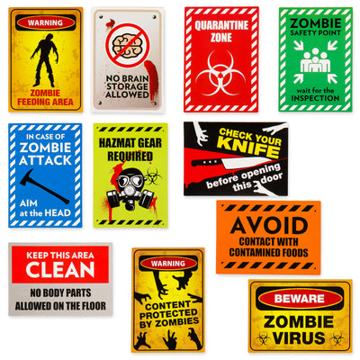 Wie uns der Film Zombieland gezeigt hat, lässt sich eine Zombieapokalypse überleben, sofern man sich an ein paar essentielle Regeln hält. Damit Du und die Noch-Menschen in Deiner Umgebung möglichst lange gegen die wandelnden Leichen bestehen können, haben wir beschlossen, eine Reihe von magnetischen Zombie-Warnschildern zu entwickeln. Diese Schilder lassen nicht nur die Herzen eines jeden Horrorfans höher schlagen, sie erhöhen außerdem die Überlebenschancen um exakt 83 Prozent.
