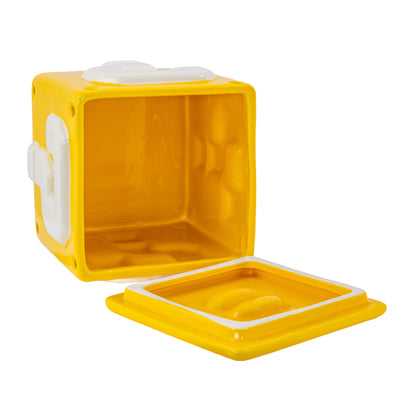 Die Dose besteht aus Keramik und ist lebensmittelecht. Auch leer ist sie dank ihres kultigen Designs eine tolle Ergänzung für den Haushalt eines jeden Super Mario-Fans.