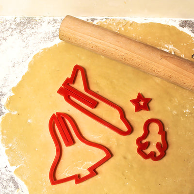 Herbst und Winter sind Keks-Zeit. Damit Du nicht auf langweilige - und wissenschaftlich ungenügende - Darstellungen von Halbmonden, Sternen und niedlichen Tieren zurückgreifen musst, haben wir uns rechtzeitig vor der Weihnachtszeit mit diesen Raketen-Keksformen eingedeckt. Damit kannst Du nicht einfach nur platte Raumschiffe herstellen, sondern kleine Bausätze aus Deinem Lieblingsteig. Einmal gebacken werden sie zusammengesteckt und Du erhältst eine von vier dreidimensionalen Raketen. Außerdem gehört zu jedem Raumschiff noch ein kleiner Keks-Pilot. Entweder ein Astronaut oder ein Alien.