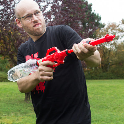 Aber was macht man, wenn mitten in der Hitze des Gefechts die Munition knapp wird? In den Nahkampf übergehen? Zu gefährlich. Aufgeben? Niemals! Die Recycling-Wasserpistole löst diese Probleme im Handumdrehen: Sie verfügt über einen Adapter, der es Dir ermöglicht, handelsübliche PET-Flaschen als Tank zu benutzen! Bei der nächsten Wasserschlacht musst Du also einfach nur ein paar Wasserflaschen in Deinem Rucksack dabeihaben und schon steht der Niederlage (und Abkühlung) Deiner Gegner nichts mehr im Weg!