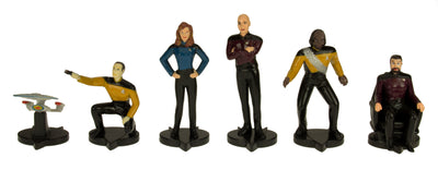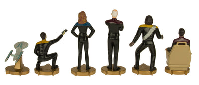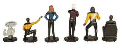 Streit um das coolere Team entsteht bei diesem Star Trek Schach nicht, weil es die Figuren (bis auf die Bauern) auf beiden Seiten gibt. Unterscheiden kannst Du sie anhand ihrer Uniformen und durch den anders farbigen Sockel. Dass Charaktere auch zwei Mal zur gleichen Zeit am gleichen Ort existieren können, wurde ja in zahlreichen Star Trek Paralelluniversum-Episoden bewiesen.