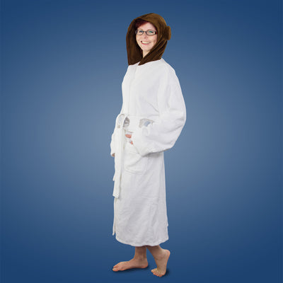 Mit dem Star Wars Bademantel Prinzessin Leia kannst Du Dich nach dem Duschen, im Schwimmbad, in der Sauna oder wann immer Du sonst einen Bademantel für das Bekleidungsstück der ersten Wahl hältst, ein kleines bisschen wie die Prinzessin fühlen. Er besteht aus hochwertiger, weicher Baumwolle und sieht genauso aus, wie das weiße Kleid, das Leia trägt - allerdings ist er viel bequemer ;)
